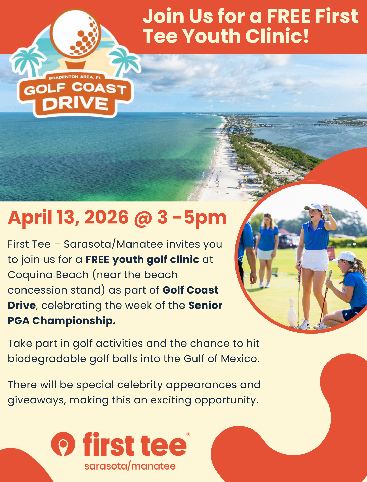 You’re invited to join us for a FREE youth golf clinic (view flyer) on April 13 from 3-5pm. Located at Coquina Beach (near the beach concession stand) as part of Golf Coast Drive, celebrating the week of the Senior PGA Championship.