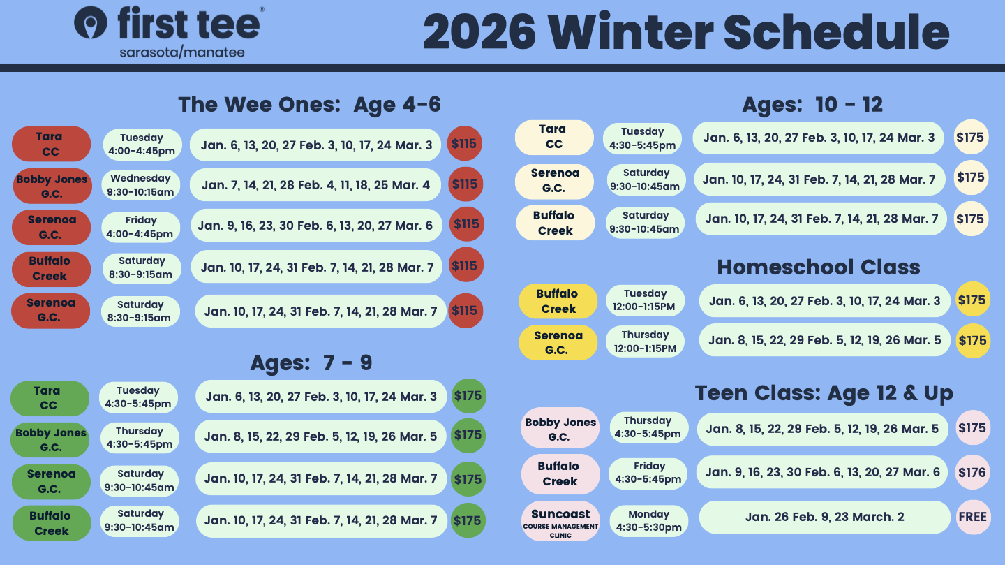 - Summer Camps: Our 2026 Summer Camps begin in June with locations across Sarasota and Manatee. Camps are open to beginners, intermediate players, and advanced junior golfers. Participants learn golf fundamentals, develop skills with First Tee Coaches and PGA professionals, and prepare for future First Tee class opportunities.