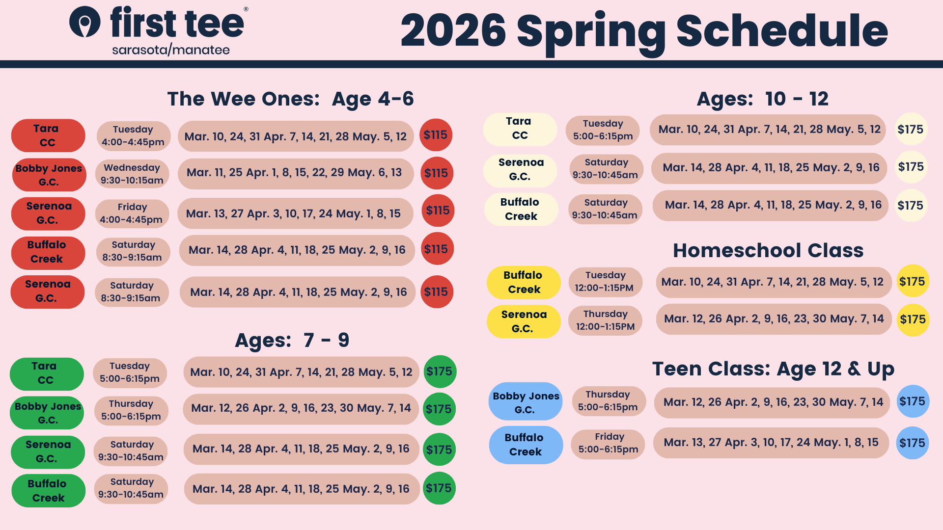 - Homeschool Classes (Ages 7–18): Designed specifically for homeschooled golfers ages 7–18, this program offers morning classes held at Palm Aire Country Club. Fee: $175 for a nine-week session.